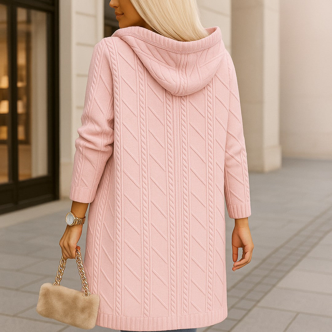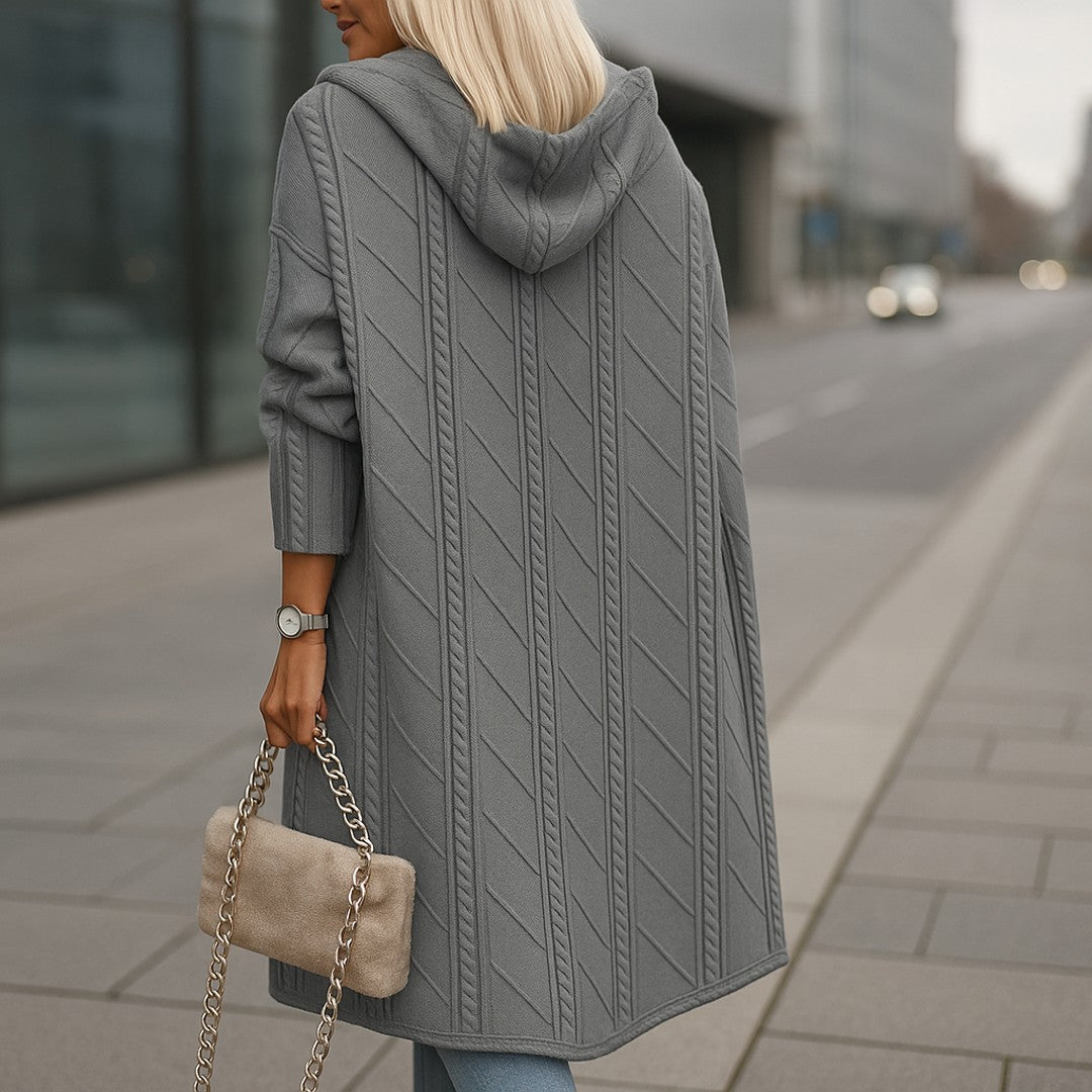 Der Cardigan-Mantel Nina wird aus hochwertigen Stoffen gefertigt, die Weichheit, Langlebigkeit und absoluten Komfort garantieren. Das gestrickte Zopfmuster mit Kapuze verleiht ihm eine zeitgemäße Eleganz – perfekt für alle, die einen vielseitigen und raffinierten Stil suchen. Warm und dennoch leicht, ergänzt er mühelos jedes Outfit und wird zum idealen Begleiter an kühleren Tagen, ohne dabei auf Weiblichkeit zu verzichten.